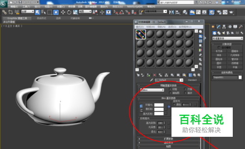打开3Dmax2012软件,点击【创建】-【几何体】-【标准基本体】-【茶壶】,在作图区域绘制一个茶壶模型并将茶壶的分段参数设置为:10,对象颜色设置为:白色(如图所示);