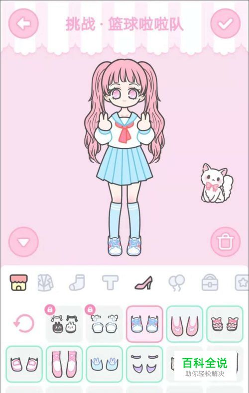 鞋子 衣领是蓝色的,裙子是蓝色的,袜子也是蓝色的,就再选一双蓝色的运动鞋作为搭配,位置见下图 穿上统一的蓝色调衣服鞋子后点击“√”提交,即可过关