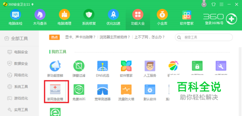 第一步我们通过“360断网急救箱”来判断是不是DNS服务异常造成黄色感叹号,点击“360安全卫士->更多->断网急救箱”,如下图所示: