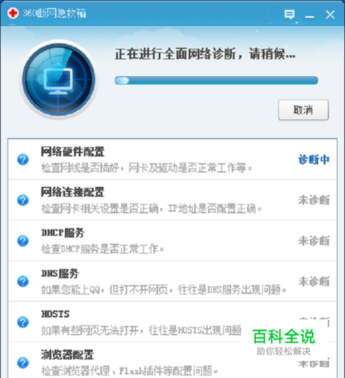 第二步点击“全面诊断”,如果出现DNS服务异常,先点击修复,再进行后面操作,如下图所示: