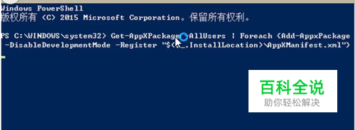 在Windows powershell窗口中, 输入 “Get-AppXPackage -AllUsers | Foreach {Add-AppxPackage -DisableDevelopmentMode -Register “$($_.InstallLocation)\AppXManifest.xml”}” 输完回车即可 待程序运行结束