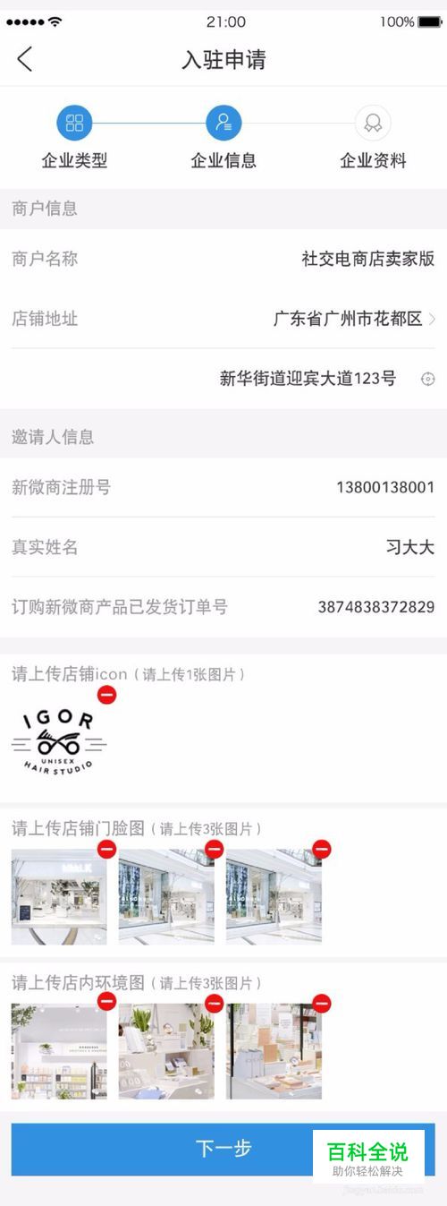 第六步是入驻申请的企业信息。 商户名称,也就是你的小程序店铺的名字。 店铺地址,就是你要定位小程序的地址。 注意的是个人版本的小程序地址可以随便填写,但是不能修改。要谨慎,最后填写你店铺的真实位置,另外企业版本的小程序,地址填写要填营业执照上的地址,企业版本的地址可以在申请下来后修改地址。 接着填邀请人信息。 新微商注册号,可以填小编的:1388888888 (仅做参考) 真实姓名:梁志文(仅做参考) 然后是填写订单号 最后填写店铺信息,店铺icon是店铺的logo 铺门脸图以及店内环境图就上传你店面的照片展示就可以了。