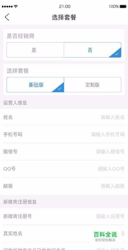 进行选择套餐,选择否经销商,接下来选择的是,基础版或者是定制版,基本版是个人版本的小程序,定制版是企业版的小程序,这里是看你在第三步的时候选择开通那种版本小程序而决定的。 接着填运营人的信息,姓名,手机号码,微信号,QQ号,邮箱。 接着就是新微商注册信息,只需要填写发货订单号就可以了。