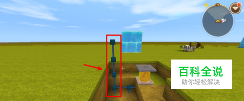 用一根蓝色电线承接,然后笔直向上蔓延3格,再高野萌宝就够不到了~ 然后在电线末端,金弹簧的正上方放置一个方块。