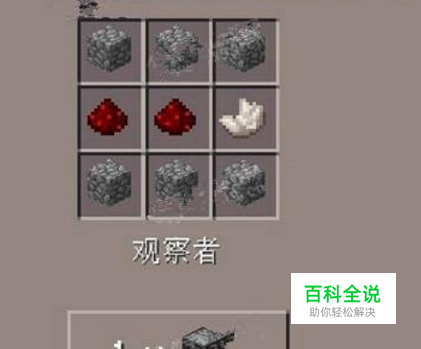 PC版本观察者的合成方式。需要材料:圆石、红石、下界石英摆放方式:如下图