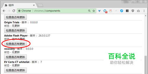 更新 Adobe Flash Player 在Chrome地址栏中输入: chrome://components,然后按 Enter 键。 在" Adobe Flash Player"下方,点击" 检查是否有更新"按钮。