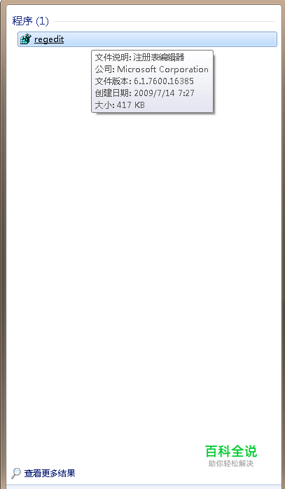 1、首先打开注册表,注册表打开不知道?好吧,我教你,点击开始,在搜索框中输入“regedit”回车就打开了。