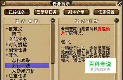 五人组队后,普陀山潮音洞30.12处领取。选择五行斗法--此等大事我定不会袖手旁观,请送我前往。