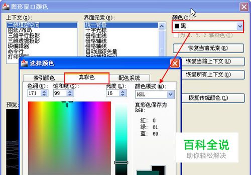 弹出的是一个标准的选择颜色对话框,但与设置图层或对象属性时不同的是,设置图层和对象属性时默认打开的是索引颜色选项卡,而设置背景颜色的时候默认显示的是真彩色选项卡。在对话框中我们可以直接输入颜色的色调、饱和度、亮度值,也可以在地下直接输入颜色的RGB值,或者直接用光标在样板上点取需要的颜色,设置好有点确定即可。