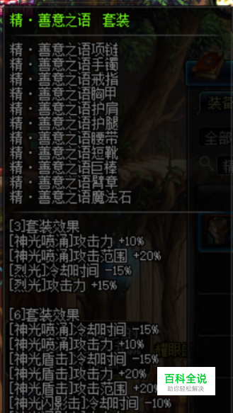 接着还需要异界套,选择善意之语6件套,部位分别是上衣、腰带、鞋子、手镯、项链、魔法石