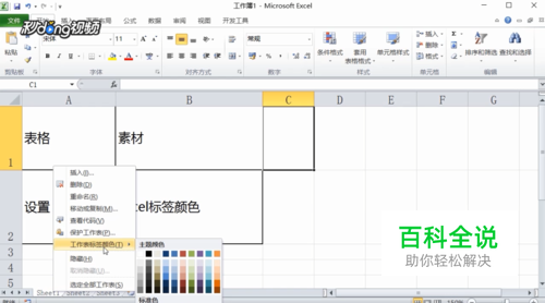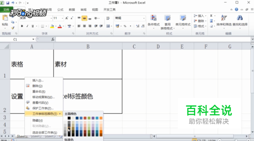 方法一:打开一个Excel样表,鼠标右击下方的“sheet1”,在弹出的选项中选择“工作表标签颜色”。