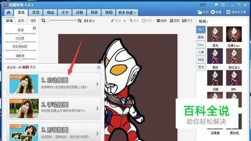 在美图秀秀里面左侧导航中找到抠图笔,然后选择自动抠图
