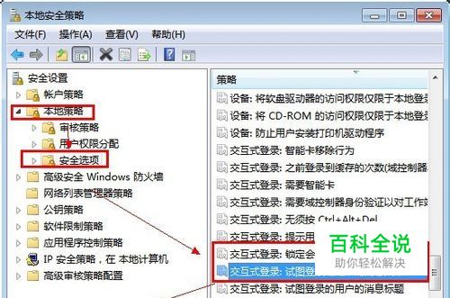 打开本地安全策略窗口,在窗口左侧依次单击“本地策略”—“安全选项”然后在窗口右侧找到“交互式登录:试图登录的用户的消息文本”和“交互式登录:试图登录的用户的消息标题”。