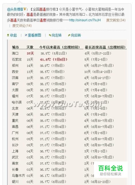 近些天的天气真是持续高温,高温继续上升的趋势,出门在外的朋友们小心自己的身体及时预防中暑, 来自新浪微薄的全国高温排行榜,温度都在35℃以上,全国还有大多数的城市温度均在30℃以上,《全城热恋》中的酷暑情形,都原原本本的复刻到了现实中,坐在带有中央空调的公司,感觉空调不给力,大街上的人们,汗流浃背的走在路上;空调被卖断了货,小腿旁边的的主机箱一阵一阵呼出热气,反映速度也变的比平常慢了半拍。 新浪微薄全国高温排行榜
