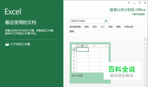 一、在电脑桌面的Excel2013工作簿程序图标上双击鼠标左键,将其打开运行。点击“空白工作簿”,新建一个空白工作簿文件。如图所示;