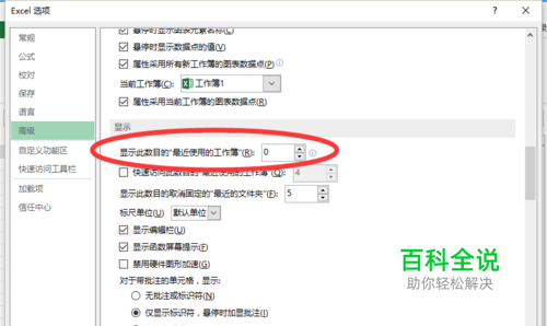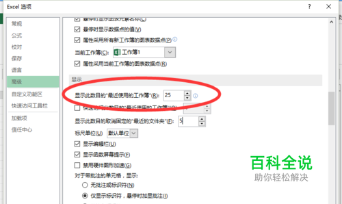 六、在“高级”选项卡的右侧窗口中,找到“显示”分组中的“显示此数目的“最近使用的工作簿”选项,此项在默认的情况下为数目“25”。如图所示;