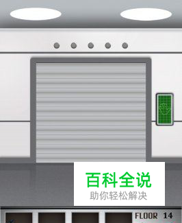 100层游戏第十四关,这关再简单不过了,电梯门的右边有个掌纹扫描器,用你的手指按在上面,待电梯门上方的五盏灯全部亮起的时候,电梯门就会自动打开了。