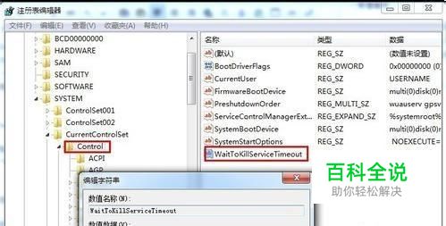 接下来就去找到HKEY_LOCAL_MACHINE/SYSTEM/CurrentControlSet/Control一项打开,可以发现其中有一项“WaitToKillServiceTimeOut”,鼠标右键点击修改可以看到Win7系统默认数值是12000(代表12秒),这里可以把这个数值适当修改低一些,比如5000(代表5秒)或是8000(代表8秒)。