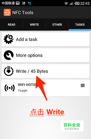 如果您是一位商务人士,那您一定会经常使用自己的3G或者4G手机作为WIFI热点分享给自己的电脑来收文件,但是每次都需要左点点右点点才能打 开,用完后为了省电又要左点点右点点马上关闭,为了节省您的宝贵的时间,我们可以使用手机的NFC功能来制作一枚NFC标签来快速打开和关闭手机的 WIFI热点。 目标:制作一枚NFC标签可以快速的打开和关闭手机的WIFI热点 准备工作1.支持NFC功能的手机,并且已经设置好了手机的WIFI热点功能(本文以小米2A为例)2.NFC标签一枚(NFC之家提供)3.安装NFC Tools和NFC Tasks(这两个软件需要配合使用NFC Tasks以插件的形式存在,平时操作NFC Tools就好了) APP下载:下载方法1.Google Play下载下载方法2.NFC之家下载 操作步骤 1.打开NFC Tools 2.点击TASKS 3.点击Add a task 4.点击WIFI HOTSPOT . 5.点击Toogle 6.点击OK 7.点击 Write 8.把NFC标签放到手机的NFC感应区域,开始写入NFC标签 9.恭喜,写入成功 结语:是不是很简单呢?当您需要开关WIFI热点的时候只需要刷一下这枚NFC标签就可以拉!
