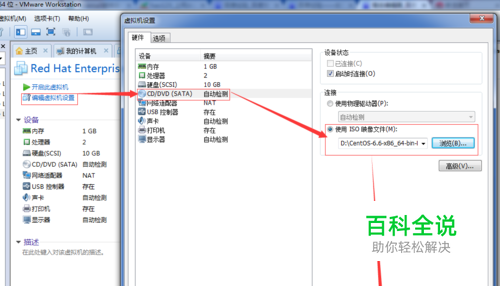 首先打开Linux虚拟机,指定CentOS6.6的镜像文件位置。 依次点击“虚拟机设置”->"CD/DVD"->"使用ISO镜像文件",然后点击“确定”按钮。