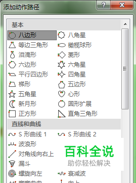 先选中要添加动画的对象,打开动画选项栏,在“动作路径”里面我们看到有直线、弧形等几种路线,打开“其他动作路径”,这里的路径就非常多了,直线、曲线、特殊的很多种类型,选择“S形曲线1”,单击确定。