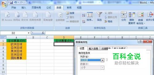 选择要设置的区域以D列为例:选择D2单元格→数据→数据有效性。