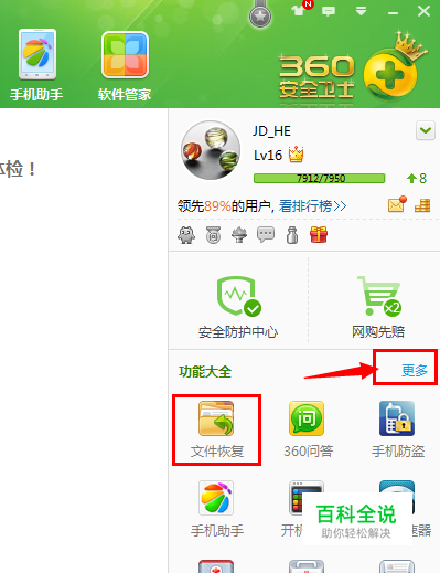 这里我介绍一种比较简单的方法,通过文件恢复功能进行文件恢复。 首先你打开你的安全卫士,假如你知道这个功能的话就直接使用就是了(如图中文件恢复选项直接使用),假如你还不知道有文件恢复功能的话,那我就先教你添加,找到如图中箭头所指的“更多”