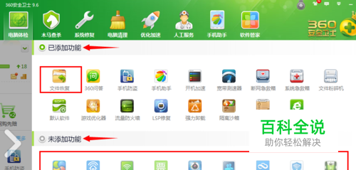 “更多”进入的界面如图所示,在已添加功能里面是你的界面里可以看到的功能选项,而在未添加功能里面就是你在界面看不到的功能,需要你自己添加后方可使用,比如我已经添加过“文件恢复”所以在已添加功能里面已经显示,但对于未添加的就在未添加功能列表里去找到“文件恢复”选项吧,点击后就可以添加了