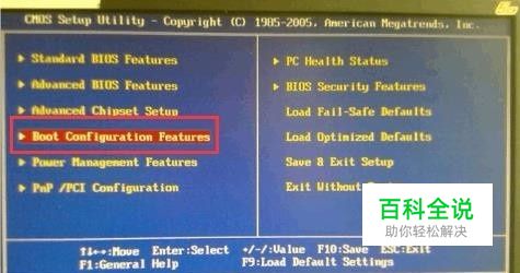 首先开机长按del键,知道方正电脑出现bios界面,然后按“↑,↓”选择boot configuration features并按回车,如图所示