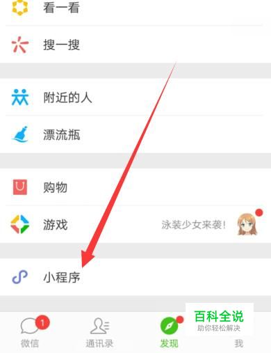 进入之后,在“发现”页面点击小程序,进入下一页面,如图所示。