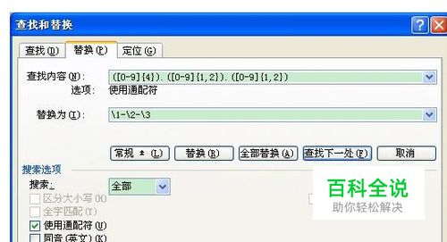 3.在“查找内容”框中,键入“([0-9]{4}).([0-9]{1,2}).([0-9]{1,2})”,在“替换为”框中键入“\1- \2-\3”(如图)。键入的内容除其中的“.”是根据文档中日期格式中的“.”输入外,其余全为半角字符,最好是在英文状态下输入。