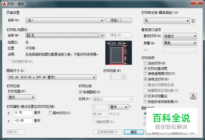 在打印-模型对话框内我们可以找到图形方向选项,默认的图形方向为纵向,如图所示: