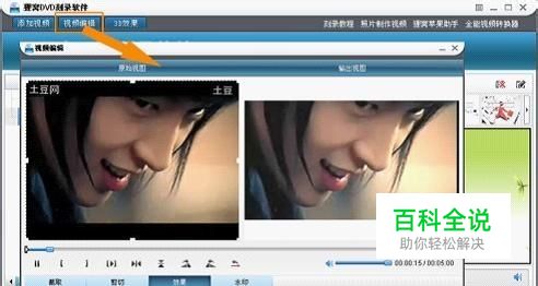 视频编辑(无需要可省略),主要有截取、剪切、效果调节、加水印等功能。选中相应视频文件,再单击主界面左上方第二个按钮“视频编辑”即进入编辑窗口。如下图所示为去黑边和调动视频的亮度、饱和度等的效果。