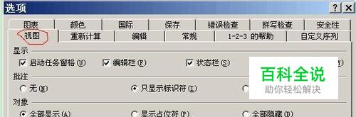 上图中,切换到“视图”选项卡,之后在该对话框中找到“行号和列标”,在其前面打上一个√,最后点击“确定”按钮退出即可。