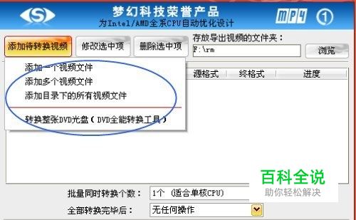 导入MOV等视频文件 在软件左上角点击“添加待转换的视频”按钮,在新弹出的文件选择框中导入MOV文件。MP4/RM转换专家有导入单个文件,多个文件和整个目录多种导入文件方式。