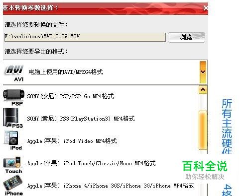 在转换列表选择自己移动硬件终端匹配的MP4格式 导入视频后,会进入“基本转换参数选择”对话框,在“请选择您要导出的格式”下拉列表选择一种自己硬件匹配的MP4,譬如手机的,就选择手机的MP4,或者iPod的MP4、iPhone的MP4等等,每一种MP4前都有对应的硬件名称和型号,非常明朗