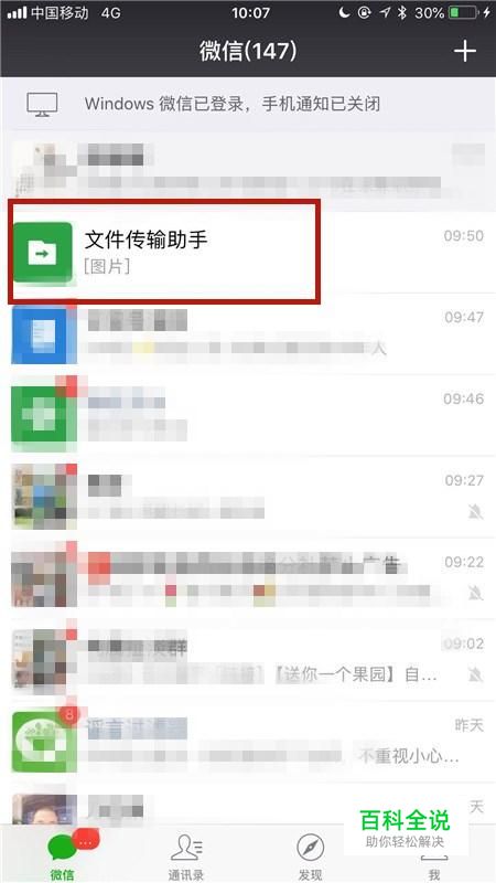 首先点击一个微信聊天对话框,如下图所示。本文以文件传输助手为例。