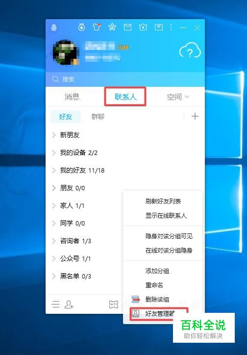 进入QQ后,我们右击联系人界面的空白处,弹出的界面,我们点击好友管理;