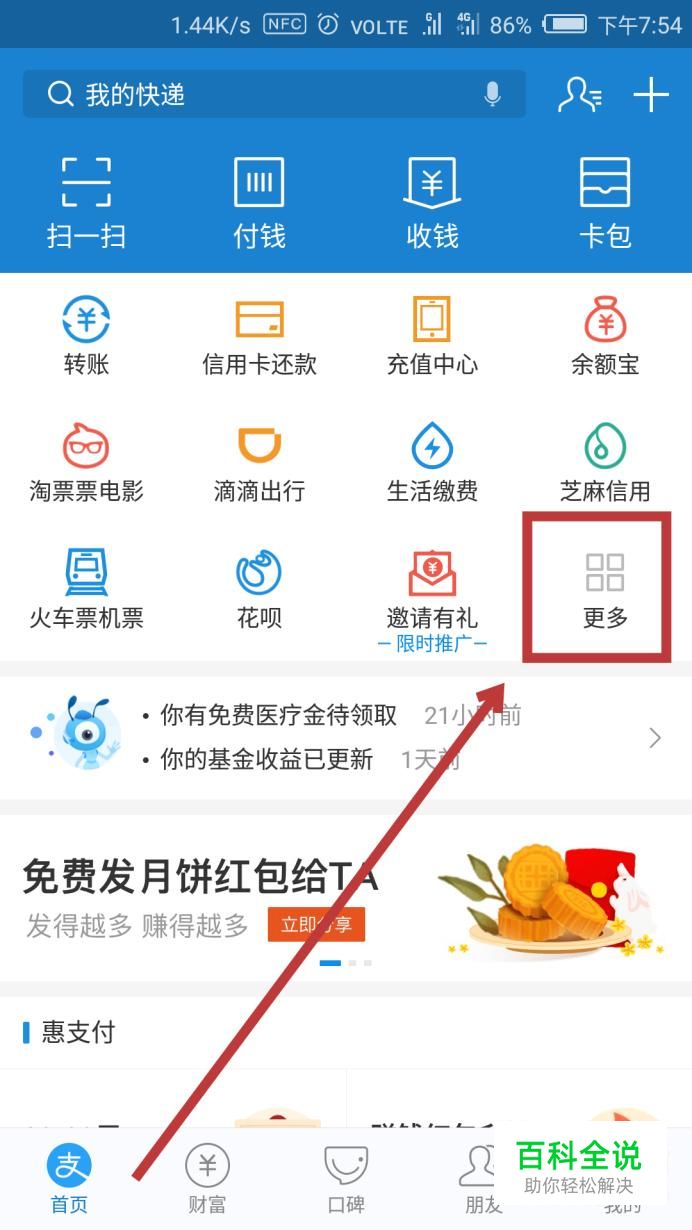 打开支付宝后,在界面中部的选项卡中找到【更多】的一项,点击进入。