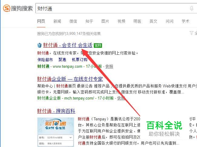 打开电脑,进入搜狗浏览器,搜索“财付通”,点击并进入,如图所示。