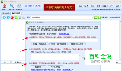 要想实现抓取商品,首先下载安装工具箱,打开工具箱后找到抓取商品,点击进去,这时会弹出一个“抓取商品使用提示”窗体,根据窗体中的红色提示信息来选择其抓取使用方式。