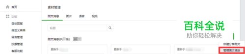 新建图文模版,可以从两个地方进入,一是从后台的素材管理处,右边绿色按钮“新建图文素材”旁的倒三角“管理图文模版”处。