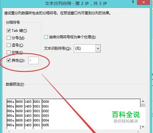 第二步:选择“其他”,在这里,符号就是你自定义了,直接采用要分列数据源中的符号即可,本次输入“-”符号 另外 “tab键”“空格”“逗号”“分号”这些弹窗都有选项,就不需要在其他里面输入了