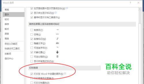 7、在显示选项卡的右侧窗格中,找到打印选项区域下的“打印在 Word 中创建的图形”选项并将其勾选“√”,最后点击“确定”按钮。如图所示;