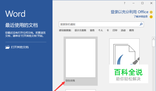 1、在计算机桌面上的Word2016文档程序图标双击鼠标左键,将其打开运行。并点击“空白文档”选项,新建一个空白Word文档。如图所示;