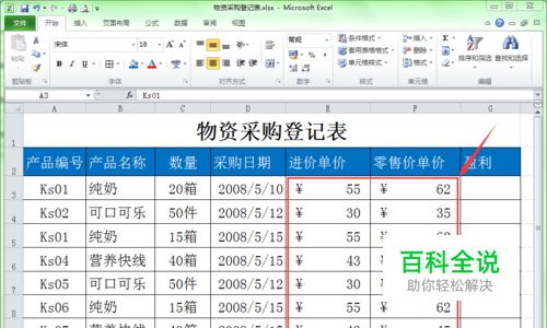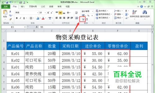 打开一个电子表格,我们可以看到“进价单价”和“零售价单价”两列中数值的小数位数都为零。