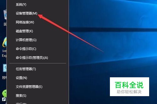 首先我们在Windows10桌面,右键点击开始按钮,在弹出菜单中选择“设备管理器”菜单项