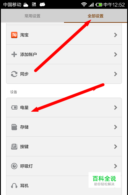 选择设置之后在界面上方选择“全部设置”--继续选择界面中间的“电量”。