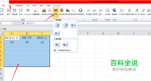 设置好内容之后,我们将已经填充好的内容选中,然后点击上方的插入,再点击饼图,可以看到有一些饼图候选选项,我们随便选取一个即可,如下图所示。