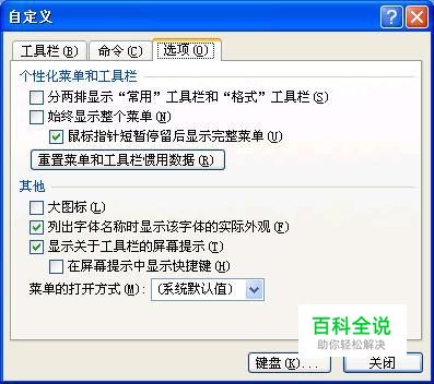 (1)单击“工具→自定义”命令,在打开的“自定义”对话框中选中“选项”选项卡。